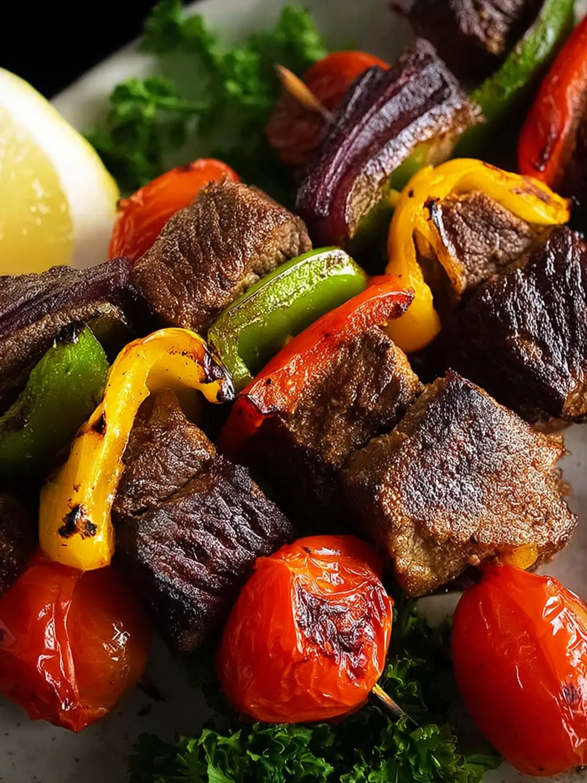 Delicious grilled beef shish kabobs marinated with spices and vegetables.