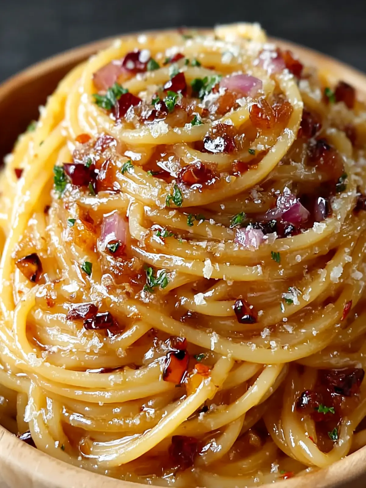 A delicious pasta dish featuring chili oil and perfectly caramelized onions.