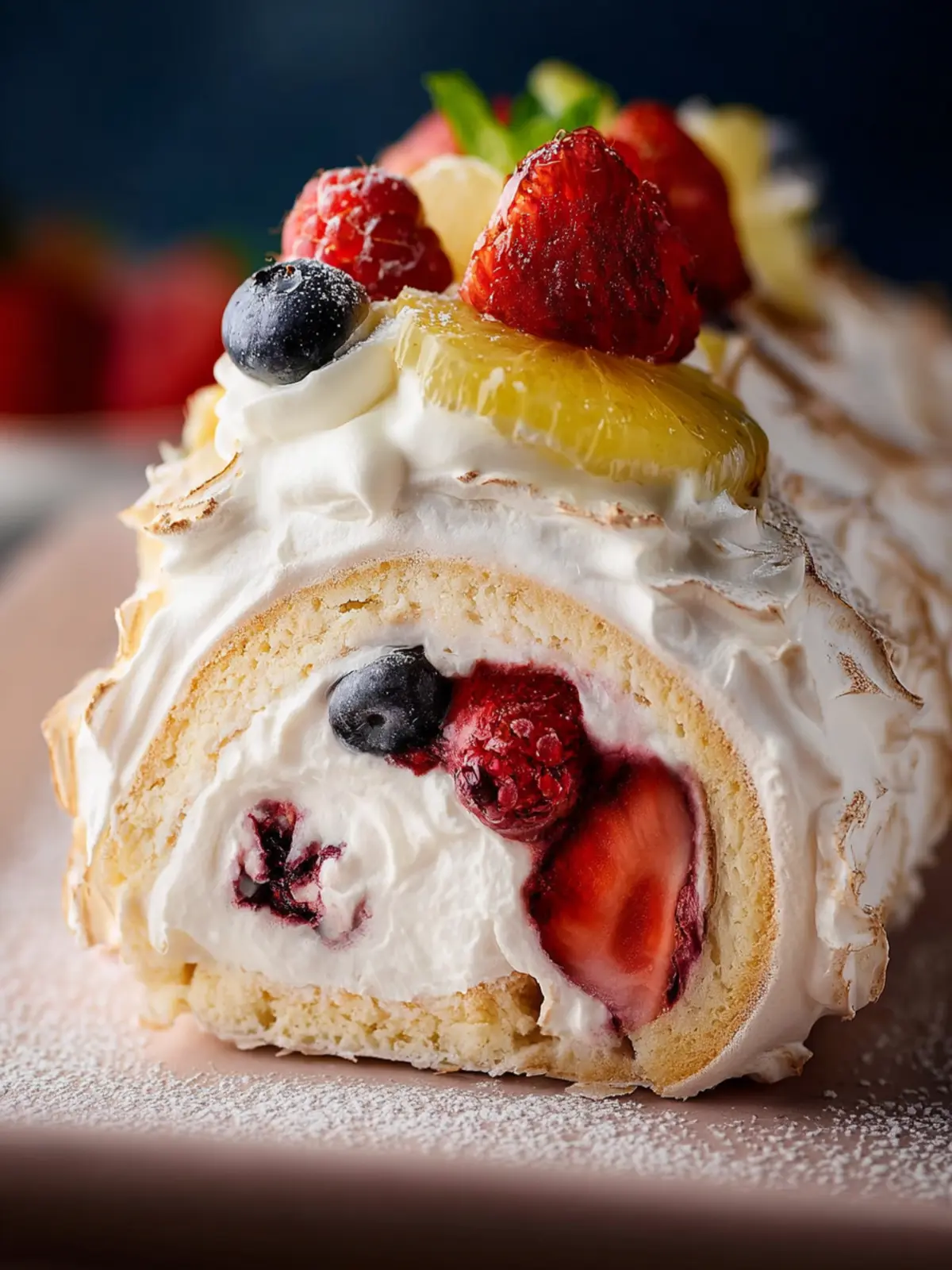 A delicious meringue roulade filled with cream and fruits.